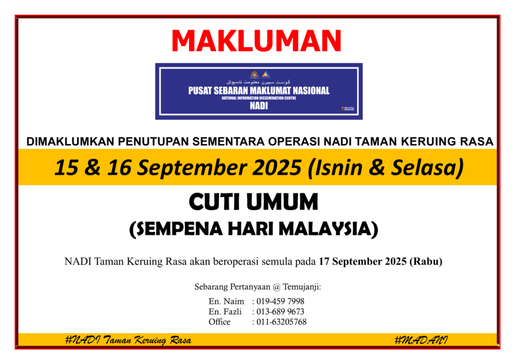 NADI Taman Keruing Rasa tidak beroperasi pada 15 & 16 September 2025 (Isnin & Selasa) kerana Cuti Umum (Sempena Hari Malaysia).