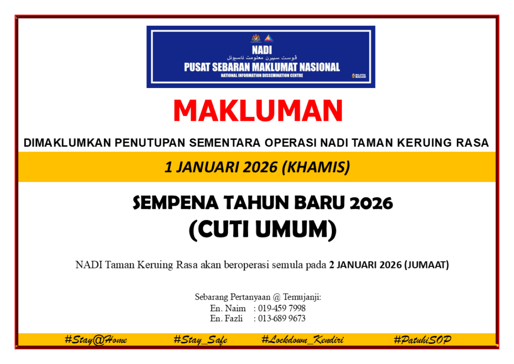 NADI Taman Keruing Rasa tidak beroperasi pada 1 Januari 2026 (Khamis) kerana Cuti Umum (Sempena Sambutan Tahun Baru 2026).