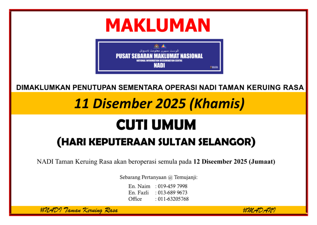 NADI Taman Keruing Rasa tidak beroperasi pada 11 Disember 2025 (Khamis) kerana Cuti Umum (Sempena Hari Keputeraan Sultan Selangor).