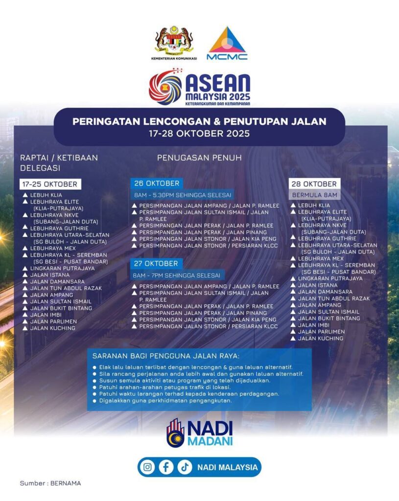 Bagi memastikan kelancaran pergerakan sempena Sidang Kemuncak ASEAN ke-47 (ASEAN Summit 2025), penutupan dan lencongan beberapa laluan utama akan dilaksanakan mulai 17 hingga 28 Oktober 2025.